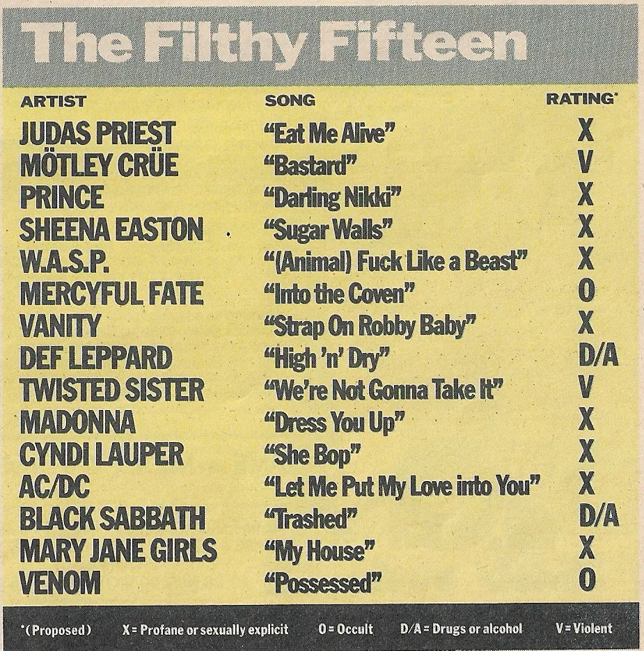 A raíz de esto, el PMRC decidió crear una lista de quince canciones a la que llamaron "The Filthy Fifteen", una recopilación de los temas más “objetables” de la época. Las catalogaron de distintas formas: X si hablaban de sexo, D/A si hablaban de drogas y alcohol, y V si eran violentas.