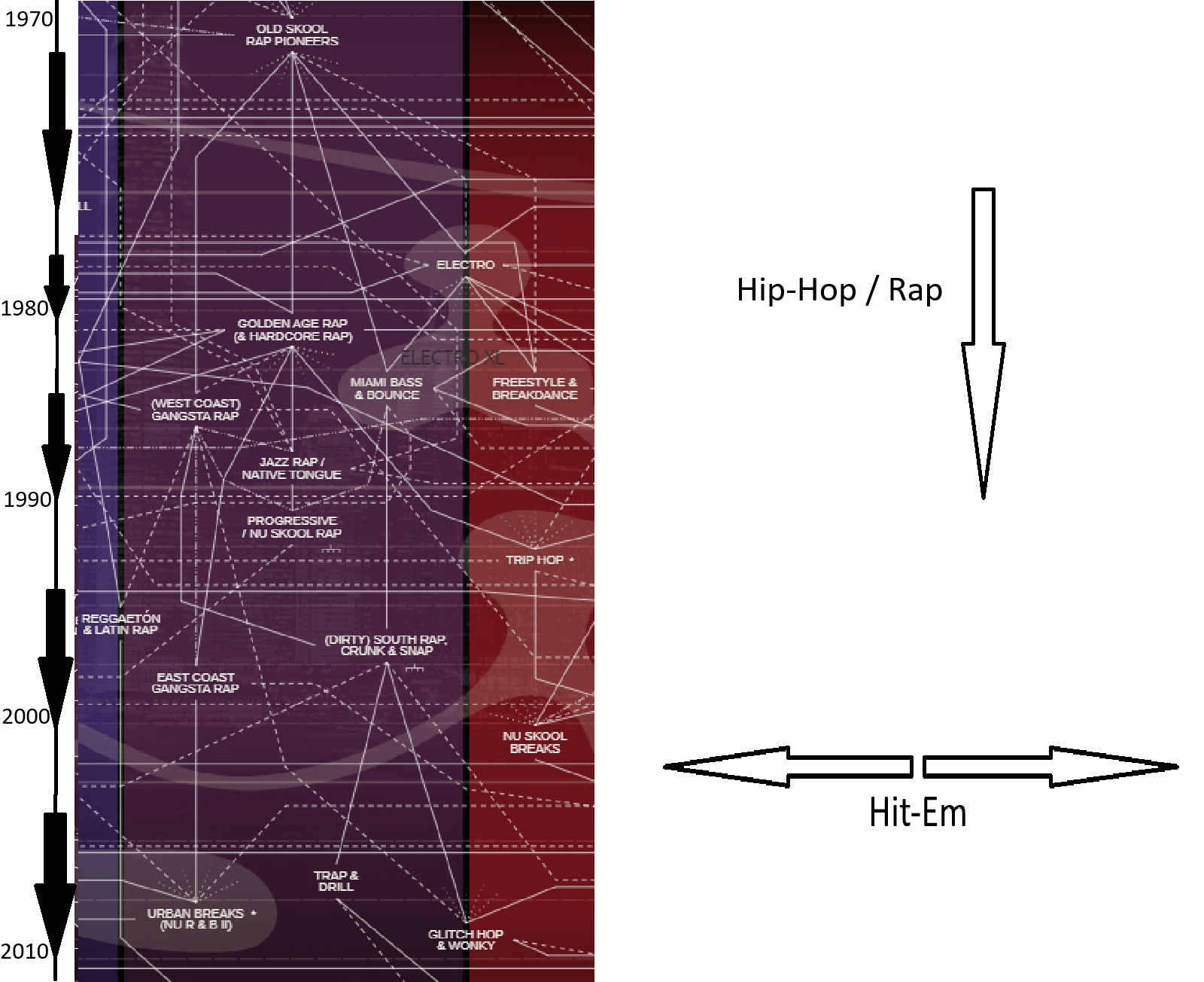 El hecho de que este género surgiera de un sueño puede parecer trivial, pero ya que estoy escribiendo un blog sobre ello puedo divagar un poco al respecto. La gran parte de la innovación en la música surge de forma vertical, construyendo sobre un imaginario colectivo de sonidos ya existentes. En el caso de Hit-Em, al no existir precedente de como debería sonar, y con 3 reglas aparentemente arbitrarias, el espacio de búsqueda disponible es mucho más diverso. Aquí intento ilustrar la diferencia entre el avanzar verticalmente, que es como donde la mayoría de la música se desarrolla, versus el desplazamiento horizontal que ofrece Hit-Em.