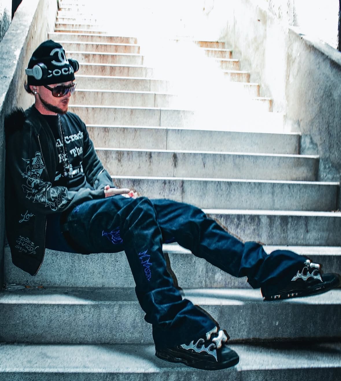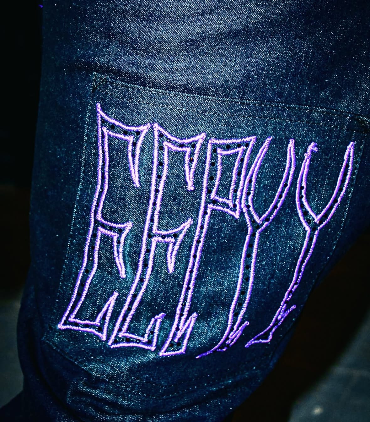 Ha trabajado con varios artistas de la escena under de la capital como pueden ser XannyDay, LilKovo, Emedemarco o $piritual haciendo piezas durísimas como este vaquero flared confeccionado para XannyDay en conmemoración de su último proyecto EEPYY (Entre El Pote y Yo), banger absoluto.